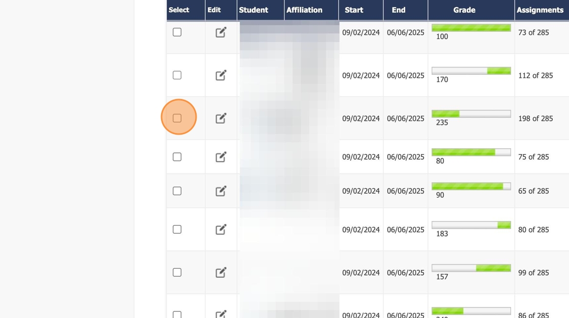 5. Scroll down to the student who is complete and click the checkbox in front of their name.
